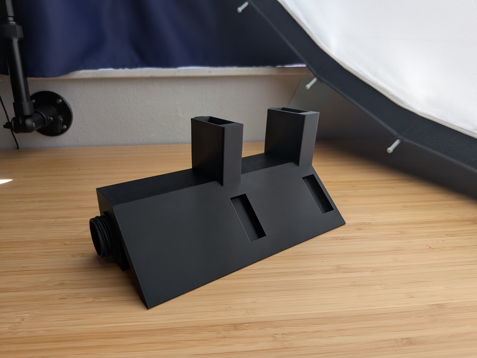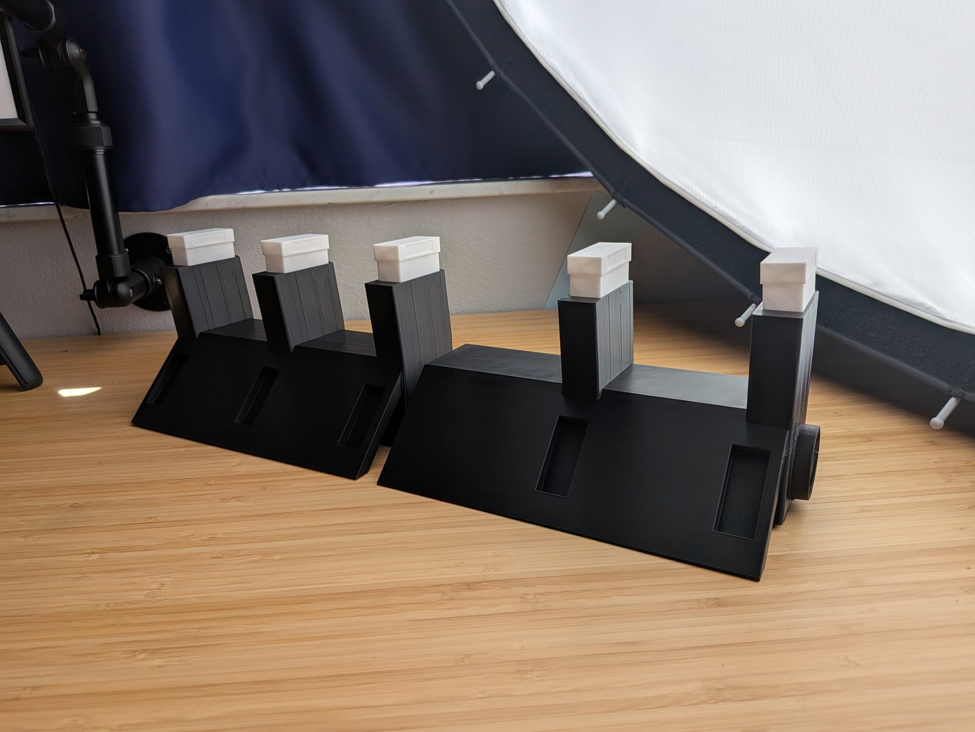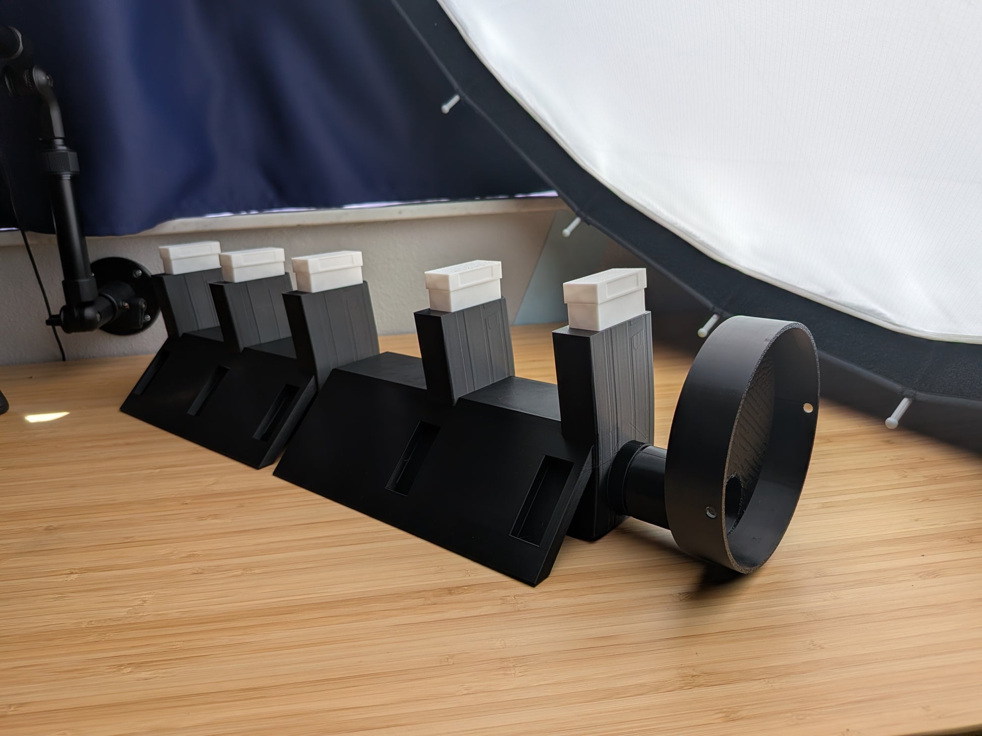 A modular cooling system that forces fan-driven airflow up through rifle barrels for speed cooling. The main body accepts and cools up to 3 rifles simultaneously. Add-on modules can be linked to expand capacity — each add-on supports +2 rifles.