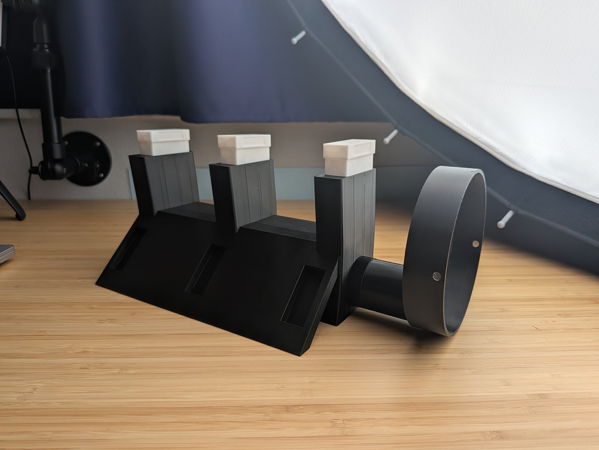 A modular cooling system that forces fan-driven airflow up through rifle barrels for speed cooling. The main body accepts and cools up to 3 rifles simultaneously. Add-on modules can be linked to expand capacity — each add-on supports +2 rifles.